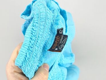 Bluzka damska w paski, z asymetrycznym wykończeniem - Krój: luźna, z krótkimi rękawami; jeden rękaw klasyczny, drugi z doszytym panelem i cienkim troczkiem. - Wzór i kolor: biało‑błękitne, ukośne ...