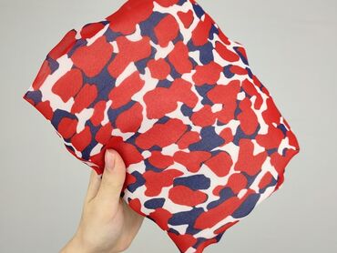 - Wzór: abstraktny, wielobarwny nadruk w odcieniach czerwieni, granatu i bieli.