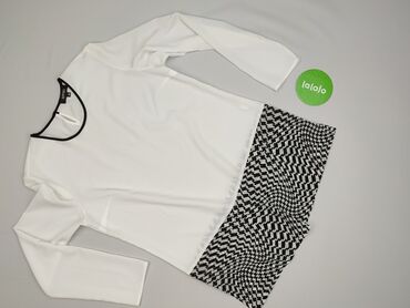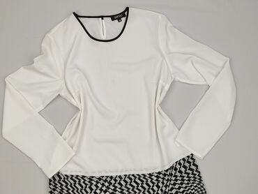 Bluzka damska z długim rękawem, rozmiar L. - Wzór: geometryczny, retro – beżowo-szare prostokąty i owalne motywy na białym tle - Fason: luźny, prosty krój - Dekolt: w serek z krótką listwą guzikow...