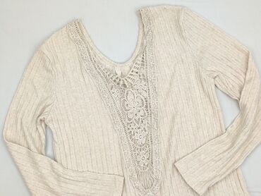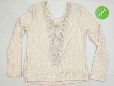 Beżowa bluzka damska marki Shein z długimi rękawami i dekoltem w kształcie litery V, ozdobionym koronkową wstawką. Delikatny wzór koronki dodaje bluzce elegancji. Fason bluzki jest luźny, zapewniaj...