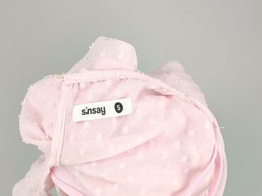 Bluzka damska Sinsay, rozmiar M. - Kolor: pudrowy róż - Krój: swobodny, lekko przedłużany - Rękawy: krótkie z falbanką - Dekolt: w kształcie litery V z ozdobnym wycięciem i lamówką - Zapięcie: guz...