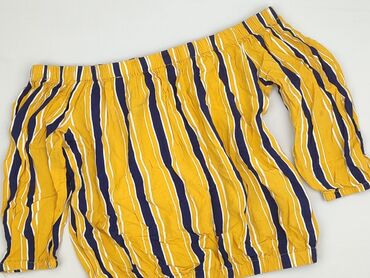 Bluzka damska Sinsay, rozmiar XS. - Krój hiszpanka – elastyczna gumka w dekolcie pozwala nosić odsłonięte ramiona. - Rękawy 3/4 zakończone gumką. - Wzór w pionowe pasy w kolorach: musztardowy, gran...