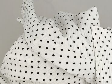 Biała bluzka w czarne grochy - Klasyczny wzór: gęste, równe kropki na białym tle - Delikatnie lejący, satynowy materiał z subtelnym połyskiem - Krótki rękaw typu cap - Okrągły dekolt z drobnymi za...