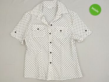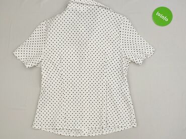 Biała bluzka damska w granatowe kropki (polka dot). - Krój: lekko wydłużony tył, zaokrąglony dół. - Rękaw: krótki, z możliwością podwinięcia i zapięcia na guzik. - Dekolt: stójka/okrągły, rozpinany...
