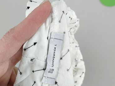 Bluzka damska SZACHOWNICA, rozmiar L. - Kolor: biały/ecru. - Materiał: 100% poliester (metka producenta na zdjęciu). - Krój: swobodny, lekko luźny. - Rękawy: 3/4. - Dekolt: w kształcie litery V z w...