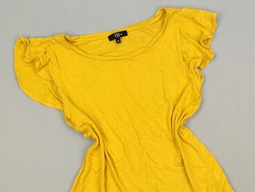Żółta, lekka bluzka damska bez nadruków - Krój: luźny, lekko wydłużony tył, zaokrąglony dół - Rękawki: krótkie, falbaniaste - Dekolt: okrągły - Przód: pionowe marszczenia/zakładki tworzące subteln...