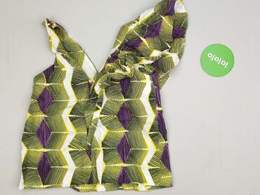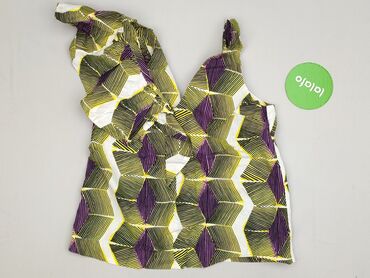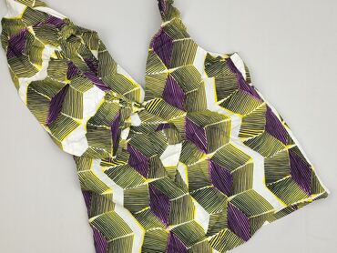 Damska bluzka bez rękawów w rozmiarze M, ozdobiona wzorzystym nadrukiem w odcieniach zieleni, żółci i błękitu. Dekolt w kształcie litery V jest wykończony ozdobną koronką w kremowym kolorze, dodają...