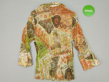 Bluzka damska O&S Paris, rozmiar M - Krótki rękaw - Zwiewna, cienka tkanina - Wzór paisley na jasnym tle w odcieniach turkusu, fioletu i zieleni - Dekolt w serek z delikatną falbaną i listwą guziko...