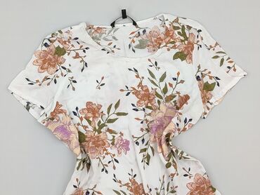 - Wzór: kwiatowy nadruk w odcieniach brzoskwini, beżu, oliwki i fioletu na białym tle