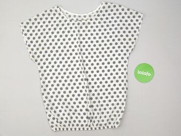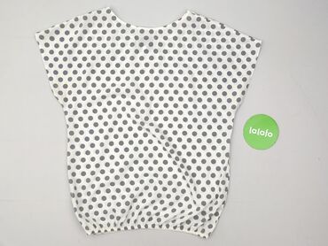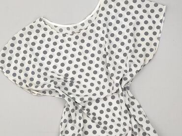 Bluzka damska z krótkim rękawem, lekko oversize, z okrągłym dekoltem. Materiał cienki, gładki i elastyczny (dzianina syntetyczna). Kolor bazowy: ecru/biel. Wzór: - górna część w drobne kropki i sz...Stan: