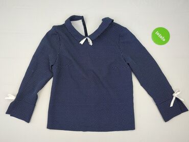 Granatowa bluzka w białe grochy - Krój: luźny, z delikatnymi zakładkami przy dekolcie - Rękaw: długi, zakończony gumką przy mankiecie - Dekolt: okrągły - Wzór: polka dot (białe kropki na granatowy...Stan: