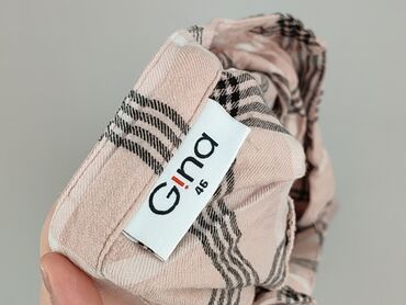 Bluzka damska marki Gina, o rozmiarze 46, wyróżnia się eleganckim wzorem szewron w odcieniach czerni i bieli. Posiada okrągły dekolt wykończony czarną lamówką oraz długie rękawy. Materiał jest teks...