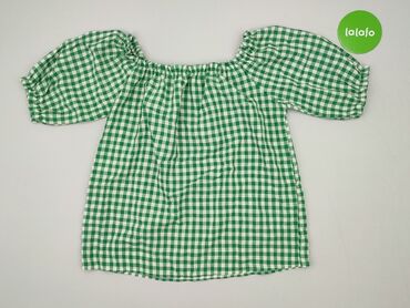 Krótki rękawBluzka damska w zielono-białą kratkę (gingham) z elastycznym dekoltem typu hiszpanka.