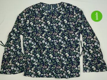 Bluzka damska z nadrukiem kwiatowym - Krój: klasyczny, lekko dopasowany, długość do bioder - Rękaw: 3/4 - Dekolt: półokrągły z kontrastową, granatową lamówką i niewielkim rozcięciem z przodu - Wzó...Stan: