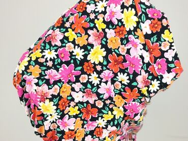- Wzór: drobna, kolorowa łąka kwiatów (róże, pomarańcze, żółcie, zielenie) na czarnym tle – wyrazisty, letni print.