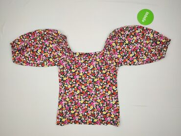 Bluzka damska KappAhl, rozmiar M - Fason: lekko taliowana, z długimi rękawami zakończonymi delikatną gumką; dekolt w kształcie litery V z krótką stójką - Wzór: gęsty, botaniczny nadruk na jasnym t...