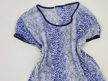 Bluzka damska z lekkiej, zwiewnej tkaniny. - Wzór: patchworkowy z motywami kwiatowymi i geometrycznymi; dominują odcienie niebieskiego, szarości, bieli oraz akcenty różu i żółci. - Krój: luźny, t...