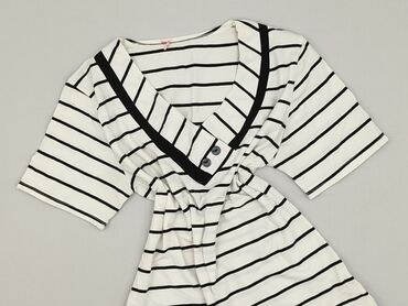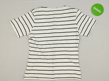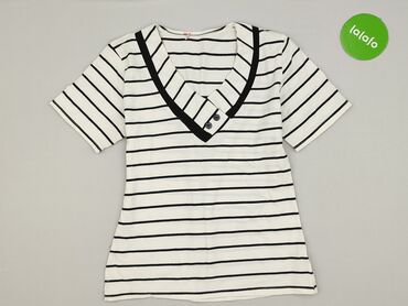 Dzianinowa bluzka damska z krótkim rękawem, w pasy kolorystyczne. - Krój: prosta, lekko dopasowana, okrągły dekolt - Rękaw: krótki - Wzór/kolor: trzy poziome pasy – u góry czarny, pośrodku beż/kar...Stan: