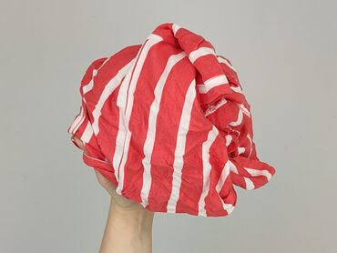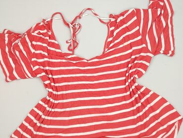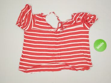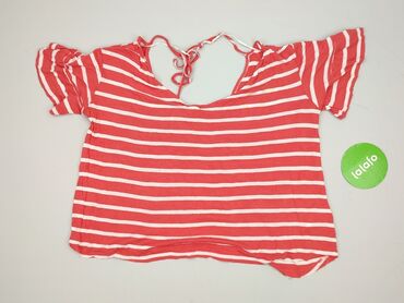 Bluzka damska w czerwono-białe pasy - Fason: luźny, prosty krój z krótkim rękawem - Dekolt: zaokrąglony z ozdobną patką zapinaną na trzy guziki przy lewej stronie - Wzór: poziome pasy; górna część...Stan: