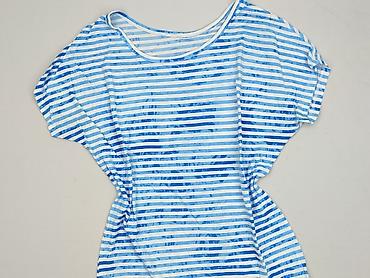 Bluzka damska w paski - Krój: luźny T‑shirt bez rękawów (delikatnie opuszczone ramiona). - Wzór: poziome paski w kolorze niebieskim na białym tle. - Dekolt: łódka z małym rozcięciem i dekoracyjnym...