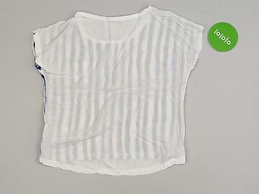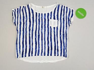 Bluzka damska w paski, z asymetrycznym wykończeniem - Krój: luźna, z krótkimi rękawami; jeden rękaw klasyczny, drugi z doszytym panelem i cienkim troczkiem. - Wzór i kolor: biało‑błękitne, ukośne ...