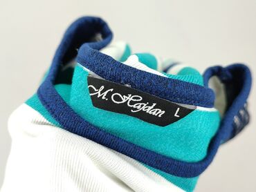 Styl marynistyczny, idealna do jeansów i letnich stylizacji. Na metce: M. Hajdan, rozmiar L. Na zdjęciu zbliżenie tkaniny oraz metki.