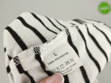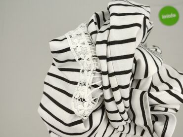 Bluzka damska w paski, rozmiar 40. - Krój: luźniejszy, z dekoltem V zapinanym na dwa złote guziki z przodu - Rękawy długie, mankiety zapinane na guziki - Wzór: pionowe pasy w kolorach bieli, czern...