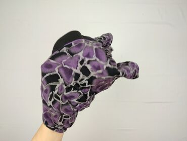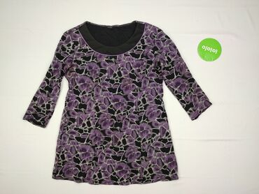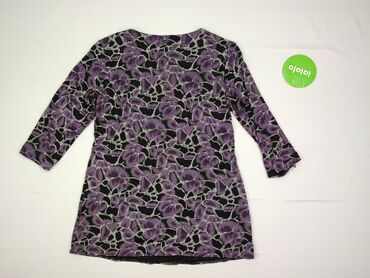 Fioletowa bluzka damska w czarny, roślinny print - Krój: luźny, lekko marszczony przy dekolcie - Dekolt: szeroki, okrągły - Rękawy: 3/4, bufiasto poszerzane, zakończone mankietem na guzik - Materi...