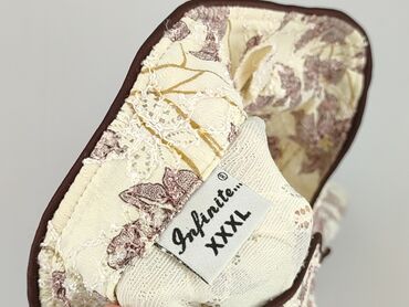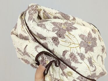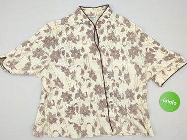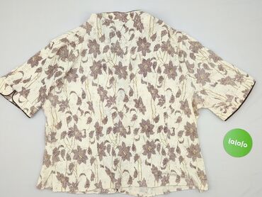 Krótki rękawBluzka damska w odcieniach beżu i fioletu, ozdobiona wzorem w kwiaty i liście. Charakteryzuje się luźnym krojem i krótkimi rękawami, co zapewnia komfort noszenia. Dekolt w kształcie litery V z obszyciem oraz zapięcie na guziki dodają jej elegancji. Bluzka idealnie sprawdzi się na co dzień, jak i na specjalne okazje. Jest to używany element garderoby w idealnym stanie.