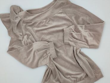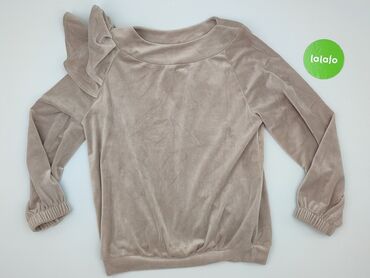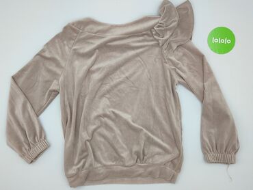 Bluzka damska oversize w kolorze ecru/śmietankowym z metalicznym, złotym nadrukiem w drobne romby. - Krój: luźny, nietoperz/dolman z obniżoną linią ramion - Dekolt: w kształcie litery V z krótką s...