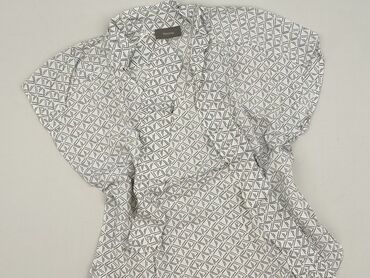 Biała bluzka damska Yessica (C&A) - Fason: koszulowy top z krótkim rękawem - Dekolt: z kołnierzykiem i rozpięciem na 3 guziki - Detale: wstawki z ażurowej koronki/siatki z przodu przy ramionach, n...