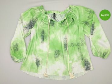 Bluzka damska w zielony, abstrakcyjny print (czarne, kremowe i lawendowe akcenty). - Fason: z zaznaczoną talią i lekką falbaną u dołu, luźne bufiaste rękawy 3/4 ze ściągaczami. - Dekolt: szeroki,...Stan: