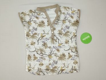 Bluzka damska O&S Paris, rozmiar M - Krótki rękaw - Zwiewna, cienka tkanina - Wzór paisley na jasnym tle w odcieniach turkusu, fioletu i zieleni - Dekolt w serek z delikatną falbaną i listwą guziko...