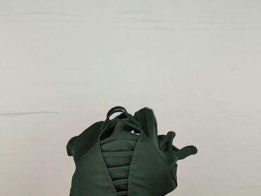 Zielona bluzka damska z krótkim rękawem. - Fason: dopasowany, z szerokim dekoltem. - Ozdobne „szelki” z przodu, zakończone dużymi guzikami. - Dwie kieszonki po bokach na wysokości talii. - Elastycz...