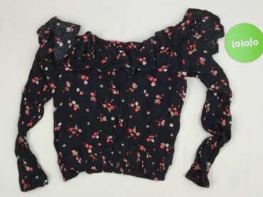 Bluzka damska z nadrukiem w drobne kwiaty - Kolor: czarne tło z wielobarwnym, drobnym motywem kwiatowym (odcienie pomarańczu, bieli, pudrowego różu); na dole oraz przy mankietach dekoracyjne, boho...Stan: