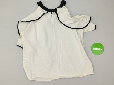 Biała bluzka damska z krótkim rękawem i falbaną przy dole. - Klasyczny, okrągły dekolt - Zapięcie z tyłu na krótki zamek - Prosty krój z delikatnymi zaszewkami modelującymi biust - Ozdobna, marszc...