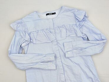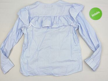 - Model: koszulowa bluzka w drobne, niebiesko‑białe paski