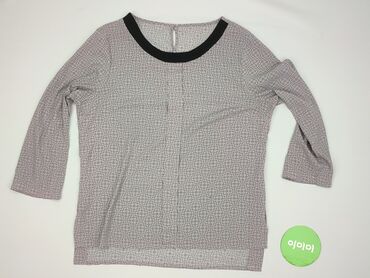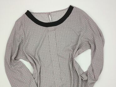 Bluzka damska z długim rękawem, rozmiar L. - Wzór: geometryczny, retro – beżowo-szare prostokąty i owalne motywy na białym tle - Fason: luźny, prosty krój - Dekolt: w serek z krótką listwą guzikow...