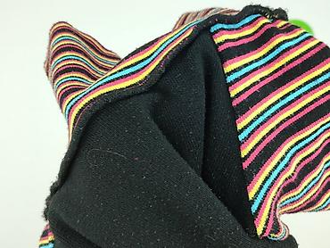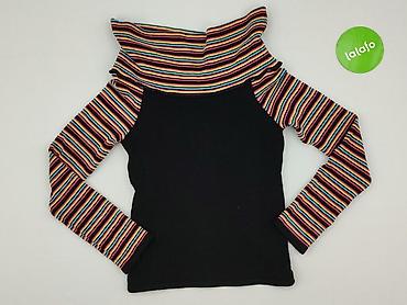 Bluzka damska z długim rękawem, z efektownym, szerokim golfem. Korpus gładki, czarny; rękawy oraz kołnierz w kolorowe, wąskie paski (róż, żółty, niebieski, zielony, biały, czarny) na ciemnym tle. Materiał elastyczny, dzianinowy – przyjemny w dotyku i dopasowujący się do sylwetki. Krój taliowany, długość do bioder. Rękawy proste, dłuższe, zakończone bez ściągacza. Golf można układać na różne sposoby (wysoko, podwinięty, luźno opadający na ramiona).