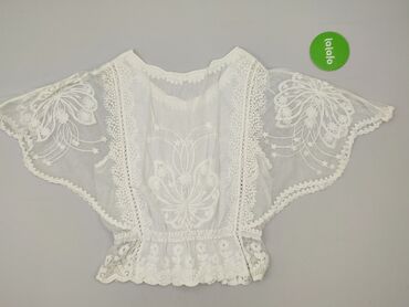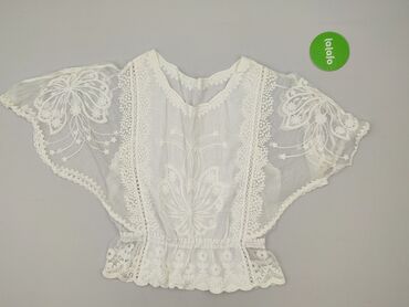 Biała, ażurowa bluzka boho z haftem - Krój: krótka, luźna, z szerokimi, motylkowymi rękawami - Dekolt: półokrągły, ozdobiony koronkową lamówką - Materiał: cienka, przewiewna tkanina (półtransparen...