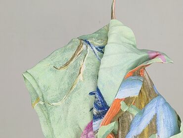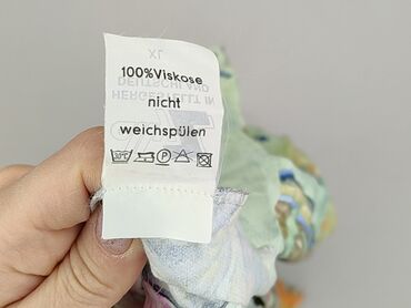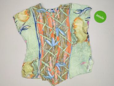 Krótki rękawBluzka damska w rozmiarze XL, wykonana w 100% z wiskozy. Charakteryzuje się krótkim rękawem i okrągłym dekoltem. Dominujące kolory to zielony, pomarańczowy, brązowy i niebieski, z nadrukiem przedstawiającym wzory roślinne. Bluzka posiada guziki na dekolcie, co pozwala na dodatkowe stylizacje. Idealna do codziennego użytku.