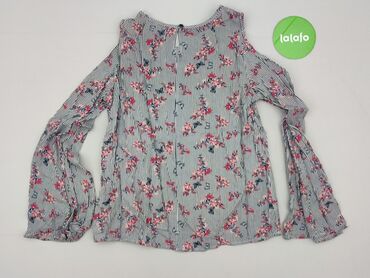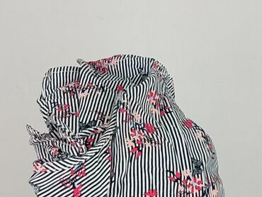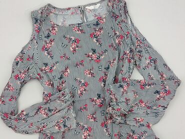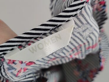 Bluzka damska WOMEN, rozmiar 36. - Wzór: drobne pionowe paseczki w odcieniach bieli i granatu, na nich nadruk kwiatów i motyli w różu, granacie i pastelowym beżu. - Krój: odkryte ramiona (cold shou...
