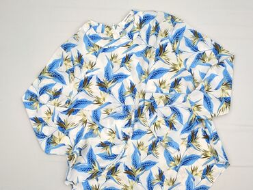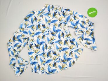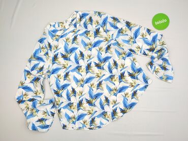 Bluzka damska „Blue” – rozmiar 40 - Fason: luźna bluzka z długim rękawem, okrągłym dekoltem i lekkim marszczeniem na dole oraz przy mankietach. - Wzór: kolorowe, tropikalne liście na granatowym tl...