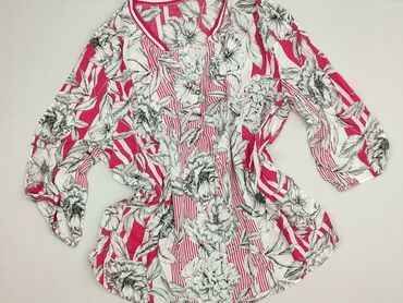 Bluzka damska NKD - Fason: luźna bluzka z dekoltem w serek - Zapięcie: krótka listwa z trzema guziczkami z przodu - Rękawy: długie, zakończone mankietem na guzik - Wzór: kwiatowy, na różowym tle (...