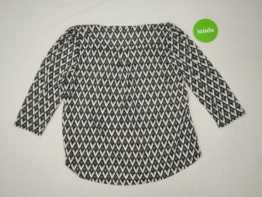 Bluzka damska marki MY OWN w rozmiarze 42, charakteryzująca się czarno-białym wzorem geometrycznym. Fason bluzki jest luźny z szerokimi rękawami typu kimono i elastycznym ściągaczem w talii, co zap...