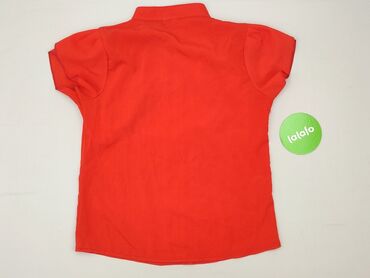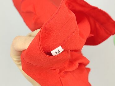 Czerwona bluzka damska z krótkim rękawem i zapięciem na guziki - Krój: lekko pudełkowy, prosty, z delikatnym dekoltem w kształcie litery V - Zapięcie: listwa z przodu na pięć materiałowych guzików...