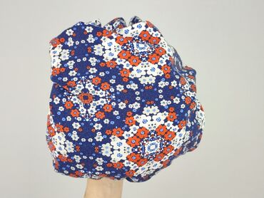 - Wzór: gęsty, kwiatowy print w kolorach granatowym, białym i pomarańczowym z geometrycznymi akcentami