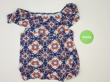 Bluzka damska hiszpanka z krótkim rękawem - Krój: odkryte ramiona (off-shoulder) z elastyczną gumką u góry oraz na rękawkach; delikatna falbana przy dekolcie. - Wzór: biało‑niebieski, kwiatowo‑rośl...Kolor: