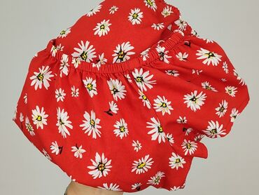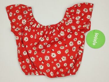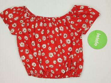 Różowa bluzka w czerwone kwiaty - Krój: krótka, hiszpanka z odkrytymi ramionami lub do noszenia na ramionach - Rękawy: bufiaste, krótkie, z marszczeniami i gumką przy zakończeniach - Dekolt: serdu...