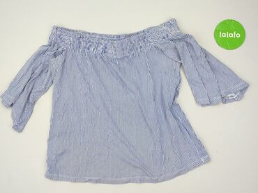 Bluzka damska HOUSE, rozmiar XS. - Krój: hiszpanka z odkrytymi ramionami, krótkie bufiaste rękawki, cienkie ramiączka - Zapięcie: rząd białych guzików z przodu - Wzór: niebiesko-białe, pionowe pas...